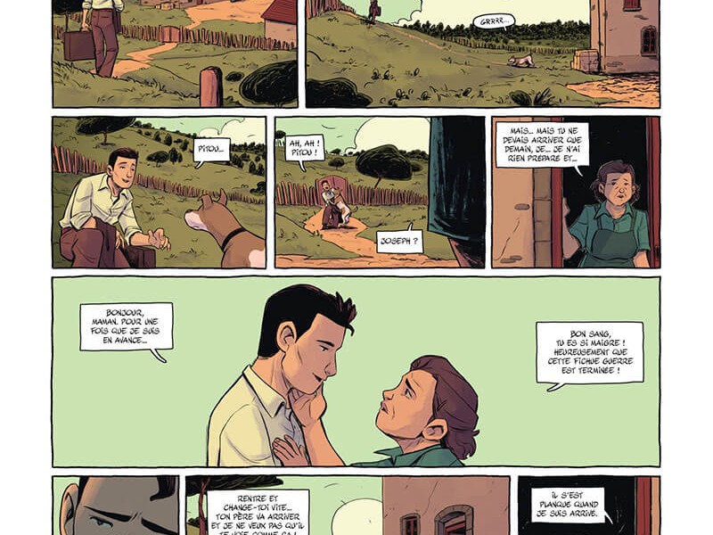 L'histoire est celle d'un jeune homme, rentrant dans son village du Massif central et étant mal accueilli par sa famille, des paysans d'une ferme écartée : en effet, Joseph encourt deux reproches : celui d’avoir laissé son frère qui a subi un grave accident et se retrouve en fauteuil roulant ; et celui d'avoir été planqué dans un bureau pendant son passage sous les drapeaux. La BD montre le décalage entre l'ancien combattant et ceux qui sont restés au pays, mais aussi entre ce qu'il peut en dire et ce qu'il pense au fond de lui-même, sans même parler des images cruelles qui lui reviennent souvent à l'esprit. Comme l'on peut s'en douter, les choses sont plus compliquées mais il ne faut pas gâcher la fin. La guerre d'Algérie sert de toile de fond de la BD (nous sommes en 1961) et elle est traitée non pas sous l'angle idéologique habituel, mais comme une guerre où des ennemis s’affrontent, dans des circonstances difficiles avec, comme toujours, les drames qui l'accompagnent. Quant aux TPST, ils constituent un arrière-plan central, justifiant le mutisme de Joseph qui ne parle pas de ce qu'il a vu. Si les engagements opérationnels contemporains ont rendu plus connus ces troubles, constatons qu'ils sont communs à toutes les guerres. Et si les soldats qui rentrent ne parlent pas de ce qu'ils ont vécu, ce n'est pas forcément qu'ils sont des planqués, ou des tortionnaires. Nous avons apprécié le dessin, au découpage classique, ne cherchant pas le réalisme forcené sans pour autant verser dans une abstraction trop stylée : un dessin simple, qui s'accorde pleinement avec l'ambiance terreuse et de terroir. Quant au scénario, nous avons particulièrement apprécié son traitement délicat qui montre à la fois les rudesses de tempérament mais aussi la noblesse de certains caractères. A noter que cette histoire complète est agrémentée d'un cahier bonus, graphique, mais accompagnant aussi une remise en perspective historique.