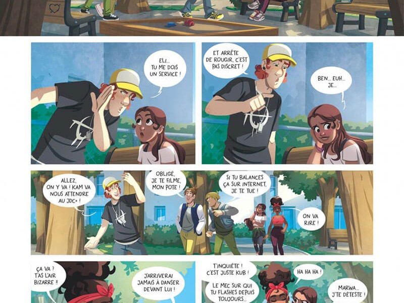 Si plusieurs bandes dessinées jeunesse abordent le thème de la danse, on est habituellement davantage du côté du ballet et des beaux quartiers que du hip-hop et des banlieues plus difficiles. Ici, l’égalité règne dans les personnages principaux, filles et garçons, de différentes origines aussi, réunis autour d’une passion commune pour le break dance, mais avec chacun une réalité bien à eux. Le genre ne permet pas d’explorer longuement chacune des vies des personnages, surtout vu leur nombre, mais la scénariste Cee Cee Mia creuse tout de même davantage le thème des classes sociales (avec à deux extrémités Finley, dont les parents plus riches tentent de l’isoler du groupe, et Sami, qui deale de la drogue pour s’en sortir) et la réalité des réfugiés syriens. Assurant le dessin et les couleurs, Lesdeuxpareilles, surnom de deux sœurs canadiennes, offre un graphisme dynamique. Créées à l’ordinateur, les planches sont vives et les mouvements de danse, bien rendus.