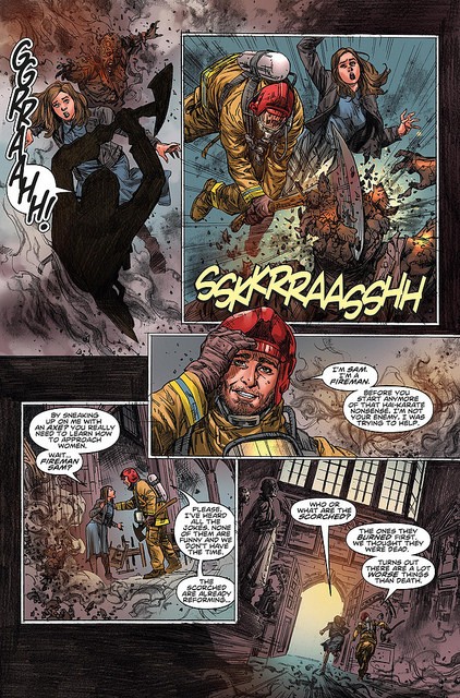 Pour rappel, est une série britannique de science-fiction créée par Sydney Newman et Donald Wilson et diffusée initialement de 1963 à 1989 sur BBC One. Elle raconte les aventures d'un extra-terrestre d'apparence humaine, le Docteur, qui voyage dans l'espace-temps à bord d'un vaisseau spatial, le TARDIS. Lorsque le Docteur est mortellement blessé, il peut survivre en se régénérant ; il change alors d'apparence et dans une certaine mesure, de personnalité. Après 26 saisons, la BBC annula la série à cause d'une baisse d'audience et d'intérêt du public. La seconde série, diffusée depuis 2005, correspond à une suite de la première série et compte déjà 10 nouvelles saisons, avec une diffusion dans de nombreux pays dont la France. Comme le titre l'indique, ce comics est quant à lui centré autour du Douzième Docteur, incarné à l'écran par Peter Capaldi. Ce comics débute alors que le Docteur vient juste de se régénérer et met donc à nouveau en scène Clara Oswald (Jenna Coleman) alias la fille impossible, comme compagne de route. Ce troisième volume débute par un mini-récit au cœur de l'Angleterre victorienne, où un alien isolé manipule les humains grâce aux ondes psychiques. Le retour à l'ère moderne se fera dans la douleur car le Tardis atterrit dans un Londres post-apocalyptique. Le Docteur se serait-il trompé de destination ? Eh bien non, mais le monde a beaucoup changé durant son absence. Clara est la première à le découvrir, cette dernière étant attaquée par un écorché, un humain qui a été brûlé par les flammes mais qui s'est relevé ensuite. Elle sera heureusement secouru par Sam le pompier (!), mais pas celui auquel on pensait. Le responsable de tous ces malheurs sur Terre ne sont autres que les Hyperions, une race de soleils vivants autrefois éclairée (spirituellement) et qui a apporté le progrès sur de nombreuses planètes. Mais après avoir atteint l'ultime stage de leur évolution, la Supernova, les aliens ont beaucoup changé et ont littéralement mis le feu à tout l'univers jusqu'à ce que les Seigneurs du Temps mettent fin à leur règne de terreur. La Terre risque d'être la prochaine victime, sauf si le Docteur parvient à contrer la menace ... avec un armement forcément venu d'ailleurs.