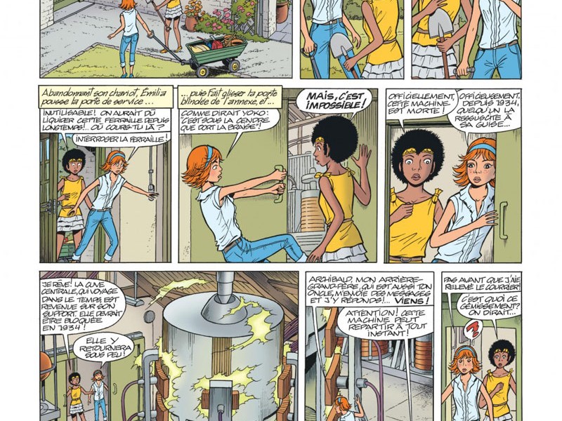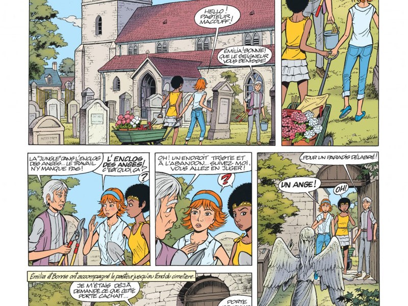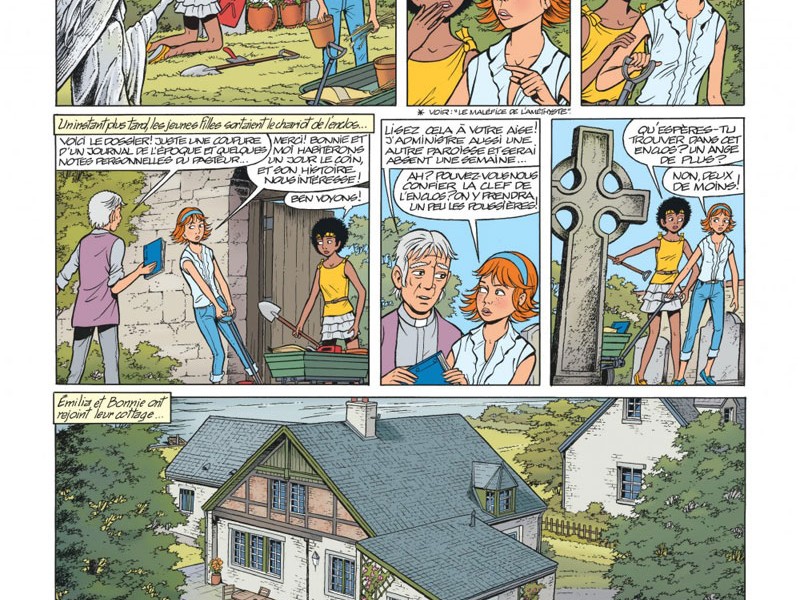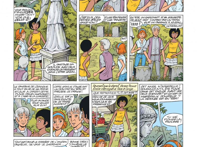 Église de Cornstone, non loin d'Edimbourg. Emilia et Bonnie viennent fleurir la tombe de la tante Gloria. Le Pasteur Macduff est également en plein jardinage, chargé d'élaguer la "jungle" de l'enclos des anges. Cet endroit délabré abrite deux tomes, les victimes d'un terrible accident. En 1935, un jeune garçon et sa soeur se sont fait happer par un train sur un passage à niveaux. La statue d'un ange, qui surveille le lieu, a été offert anonymement en 1934, ce qui ne manque pas d'interloquer Emilia. Elle décide donc d'aller d'utiliser la machine temporelle présente dans le cottage pour contacter son arrière-grand-père Archibald (qui est aussi l'oncle de Bonnie) et de lui envoyer un message afin qu'il sauve les deux enfants. Mais comme la machine est sur le point de repartir pour de bon dans le passé, Emilia n'a pas d'autres choix que de se précipiter à l'intérieur et de partir en 1935. Bonnie ne sait pas quoi faire si ce n'est de prévenir Yoko