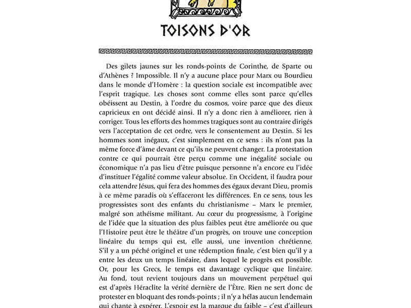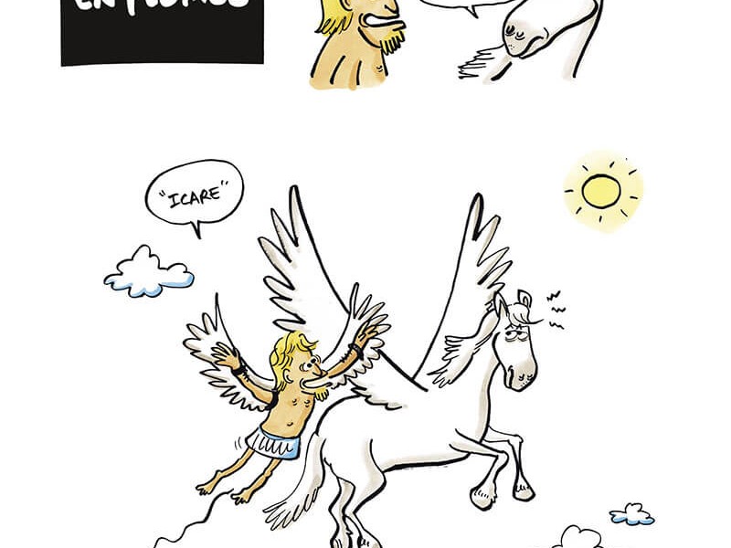 Après avoir lu les albums sur les philosophes (La planète des sages et Platon La Gaffe) de ces mêmes auteurs, nous voici plongée dans la mythologie grecque avec un titre qui annonce la couleur : il y aura de nombreux thèmes abordés et l’humour sera forcément présent, que ce soit avec des jeux de mots ou des réflexions ironiques. Et bien sûr, ce sera chaud aussi car Zeus ne dit jamais non à une belle femme ! Comme pour les autres albums, chaque sujet est présenté sur la forme d’une ou deux planches de dessins très amusants et colorés et on y reconnaît bien le style de Jul. Ensuite vient un texte sur une ou deux pages rédigé de façon subtile et cocasse par Charles Pépin, qui connaît bien le sujet et sait le présenter de façon abordable qui donne envie d’en apprendre plus. On voit aussi que les réactions et les motivations de tous ces Grecs, Dieux ou non, ne sont pas très différentes de celles du commun des mortels de notre époque … à part que certains ont des super-pouvoirs contrairement à nous. Il faut un certain temps pour lire l’album car il est assez dense et en plus, il se savoure.