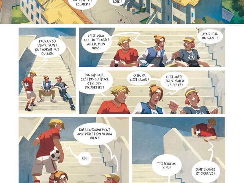 Si plusieurs bandes dessinées jeunesse abordent le thème de la danse, on est habituellement davantage du côté du ballet et des beaux quartiers que du hip-hop et des banlieues plus difficiles. Ici, l’égalité règne dans les personnages principaux, filles et garçons, de différentes origines aussi, réunis autour d’une passion commune pour le break dance, mais avec chacun une réalité bien à eux. Le genre ne permet pas d’explorer longuement chacune des vies des personnages, surtout vu leur nombre, mais la scénariste Cee Cee Mia creuse tout de même davantage le thème des classes sociales (avec à deux extrémités Finley, dont les parents plus riches tentent de l’isoler du groupe, et Sami, qui deale de la drogue pour s’en sortir) et la réalité des réfugiés syriens. Assurant le dessin et les couleurs, Lesdeuxpareilles, surnom de deux sœurs canadiennes, offre un graphisme dynamique. Créées à l’ordinateur, les planches sont vives et les mouvements de danse, bien rendus.
