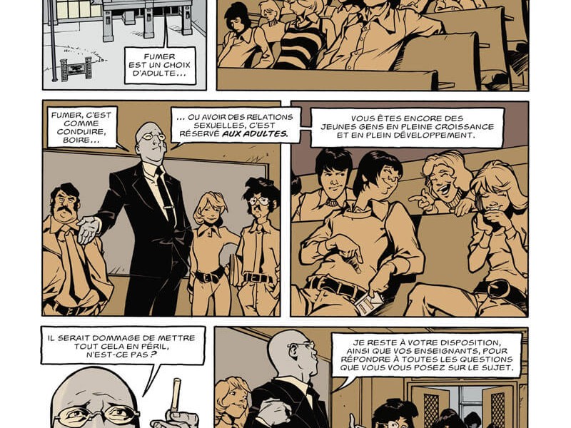 On retrouve également un long passage sur la création d'un centre de recherche sur le tabac financé par Big Tobacco et destiné à truquer les données. Pourtant, l'ouvrage rappelle que le cowboy employé dans les publicités Marlboro a été fréquemment changé, les précédents ayant tous été frappé par un cancer du poumon. Rien n'a voir avec le tabac, selon l'industrie, il n'avait qu'à faire du sport. On découvre également l'utilisation du tabac pendant la guerre, censée symboliser le "symbole du partage et du patriotisme", l'utilisation de l'émancipation des femmes par les communicants pour justifier le fait qu'elles doivent fumer également, les liens entre Hollywood et l'industrie (par exemple Stalonne a du fumer des Brown & Williamson dans cinq films pour toucher 500.000 dollars, alors que d'autres acteurs ont reçu des cadeaux pour poser avec des cigarettes), mais également le fait que l'industrie du tabac est la plus polluante du monde après le pétrole. On découvre également les mesures que les pouvoirs publics ont pris pour tenter de stopper l'hémorragie, à une époque pas si lointaine, il était possible de fumer partout, quelque soit l'âge. L'ouvrage se conclut par un dossier rempli de chiffres, d'études et de données pour résumer ce que l'auteur Pierre Boisserie à énumérer (et souvent dénoncer) dans cet album de 160 pages. Le tout mis en images de manière très dynamique par Stéphane Brangier dans un style qui rappelle celui de Will Eisner, sans compter la présence d'un personnage ironique, Mr Nico, qui donne les explications au fur et à mesure de la lecture et qui représente très clairement la position des industriels. Pour rappel, 78.000 personnes meurent chaque année en France à cause du tabagisme.