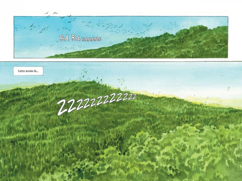Wataru arrive dans la région à l’âge de neuf ans. Il est dans une situation de quasi orphelinat. Ces grands-parents l’accueillent dans cette contrée reculée du Japon. Jusque-là il avait vécu à Tokyo. Son intégration s’avère difficile notamment avec les autres enfants du village mais la forêt exerce sur lui une profonde attirance. En effet, des voix lui parviennent de cette forêt. Les animaux lui parlent et l’encouragent à pénétrer dans cette luxuriante et encore vierge nature. L’album de Taniguchi est débarrassé de toute contrainte. Les cases peuvent occuper l’ensemble d’une page ou même deux. Le sens de la lecture de ces images, parfois sans parole, varie. A la fin du livre, l’éditeur de Taniguchi témoigne du travail effectué. Il en explique l’originalité et décrit la mutation graphique qui était en cours.
