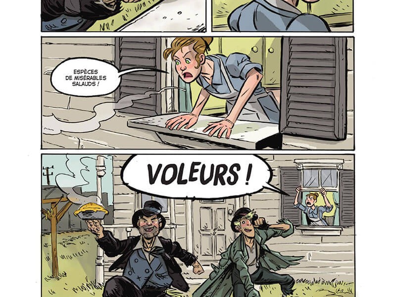 Deux clochards en fuite après avoir été faussement accusés de meurtre. C'est un roman graphique humoristique. Les drôles de répliques musicales s'avèrent particulièrement efficace. L'histoire commence de façon si innocente avec des vagabonds qui volent une tarte à la fenêtre, mais cela devient rapidement plus sombre. A partir de là, c'est toute une aventure. Tous les tropes classiques des histoires de l'époque de la dépression sont présents. Il y a même une représentation homosexuelle, ce qui n'est pas si fréquent dans ce genre de récit. Un narrateur invisible nous guide avec des côtés spirituels, des suggestions de musique à thème et une prédiction inquiétante occasionnelle. Parfois, cela ait penser à certains des vieux dessins animés de Disney (Robin des Bois ou peut-être Le Livre de la Jungle). C'est amusant, irrévérencieux et idiot avec des moments sérieux occasionnels. Les personnages de Jed et Thanny ne seraient pas hors de propos dans les contes de Cannery Row de John Steinbeck ou de Huck Finn de Mark Twain.